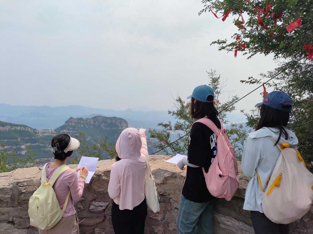在调研开始前,杨敏向学生强调了野外工作在专业学习过程中的重要性,分配了课程实践任务,并强调了野外实践过程中的安全问题。在抱犊寨山脚下,杨敏讲授抱犊寨形成的地学成因及旅游特色,并结合抱犊寨的旅游开发情况,讲授旅游资源开发与环境保护之间的关系;在群山环绕中,讲授山丘型景观的资源特点、旅游功能和调查评价要点;在南天门讲授山顶门庭建筑的风格和历史文化内涵,同学们被深深吸引,身临其境领悟地学旅游的奥秘。