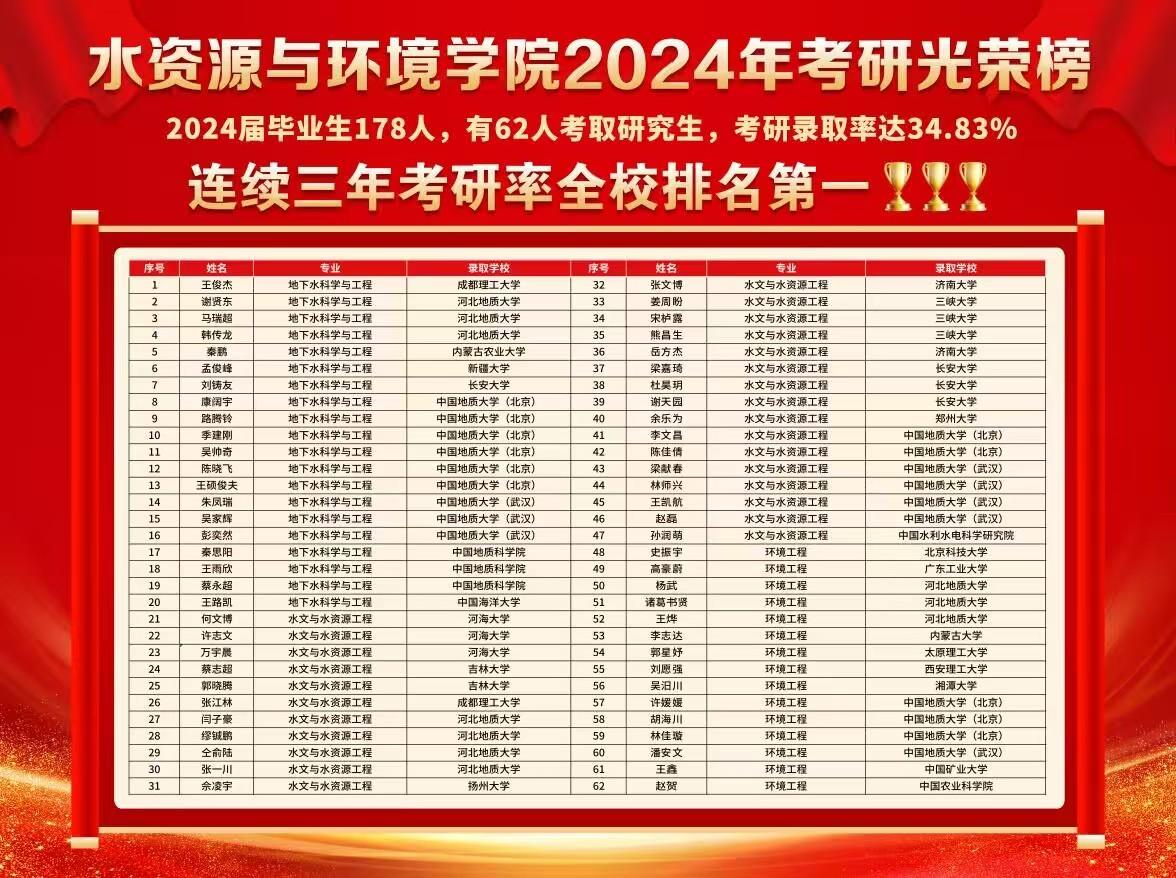 研究生入学考试逐渐成为当下大学生追求学术深造和职业发展的重要途径。英国beat365官方网站水资源与环境学院高度重视学风建设,历年来通过朋辈引领、考研经验交流会等活动积极动员学生考研、为大家提供宝贵经验,近三年分别以考研率29.61%、32.72%、34.83%的成绩连续斩获第一名。