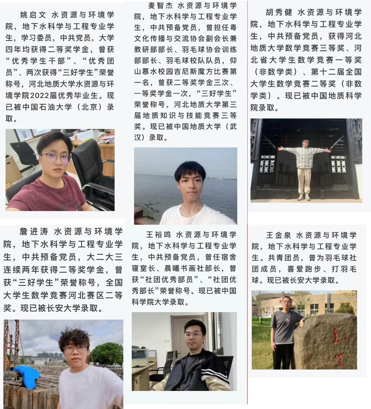 在优良学风的熏陶下,水资源与环境学院连续三年涌现了“学霸宿舍”。2022年我院一男生宿舍六人报考,姚启文、詹进涛、王金泉、麦智杰、胡秀健、王裕鸣分别被中国石油大学(北京)、长安大学、长安大学、中国地质大学(武汉)、中国地质科学院、中国科学院大学录取;2023年,我院眷一-1-401宿舍四人报考,刘昊泽、周鑫龙、王敬宽、宋学强分别被中国地质大学(北京)、大连海事大学、华北电力大学(保定)、英国beat365官方网站录取;2024年,我院学八529宿舍6人报考:蔡永超被中国地质科学院录取、王硕俊夫、吴帅奇、陈晓飞、康阔宇4名同学被中国地质大学(北京)录取、吴家辉同学被中国地质大学(武汉)录取。