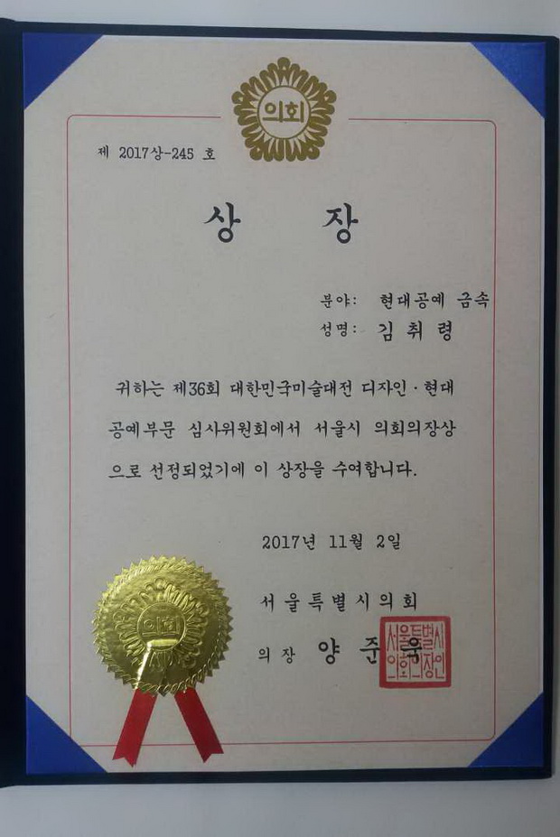韩国美术大展是由韩国美术学会主办,包含视觉传达设计、陶瓷工艺、大漆工艺、金属工艺等多种设计学科的综合类大型比赛。比赛分作品征集及入围评奖两个阶段,奖项分为“最优秀奖”、“优秀奖”、“首尔市议会议长奖”等奖项,金属工艺组前两项均未有获奖者,beat365金翠玲老师的作品《流逝》在近500件入围作品中脱颖而出,获得“现代工艺组——首尔市议会议长奖”,为beat365在国际赛事中争得了荣誉。