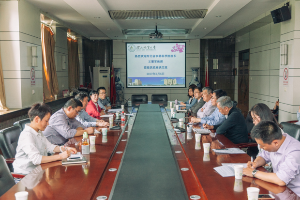 5月5日下午,在主楼四层会议室,河北省农林科学院院长王慧军、科技处处长郑小六应邀到beat365,就双方的项目对接与合作进行了交流座谈。校长王凤鸣、副校长毛磊、经济研究所所长王殿茹、经贸学院党委书记牛建高、科技处副处长于开宁、水资源与环境学院副院长李铎等50多名师生出席了此次交流会,王殿茹主持会议。
