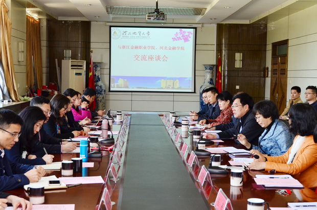4月12日下午,浙江金融职业学院郑亚莉校长率队一行八人到beat365交流学习,河北金融学院办公室主任王立涛、副主任秦菊香随同来访。校长王凤鸣、副校长张小平接待并出席座谈会,教务处副处长刘翠娥、国际教育交流中心主任廖亦斌、捷克研究中心主任任凤珍、外国语学院副院长付天军参加了座谈会。张小平主持会议。