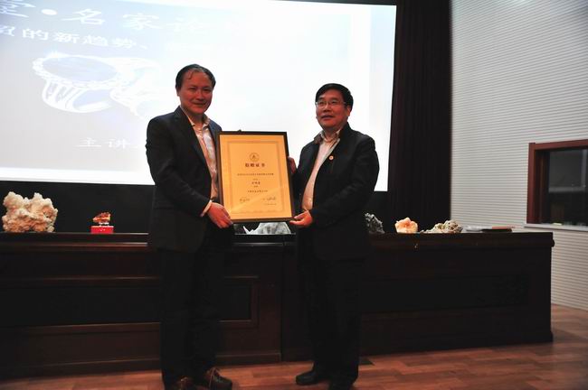 报告会开始前,於教授向母校捐赠了矿物及宝玉石标本,包括孔雀石、葡萄石、萤石、自然铜等10件精美标本,其中还有极为罕见的八面体黄铁矿。王凤鸣感谢於教授的捐赠和对母校的支持,为於教授颁发了捐赠证书和客座教授聘书。