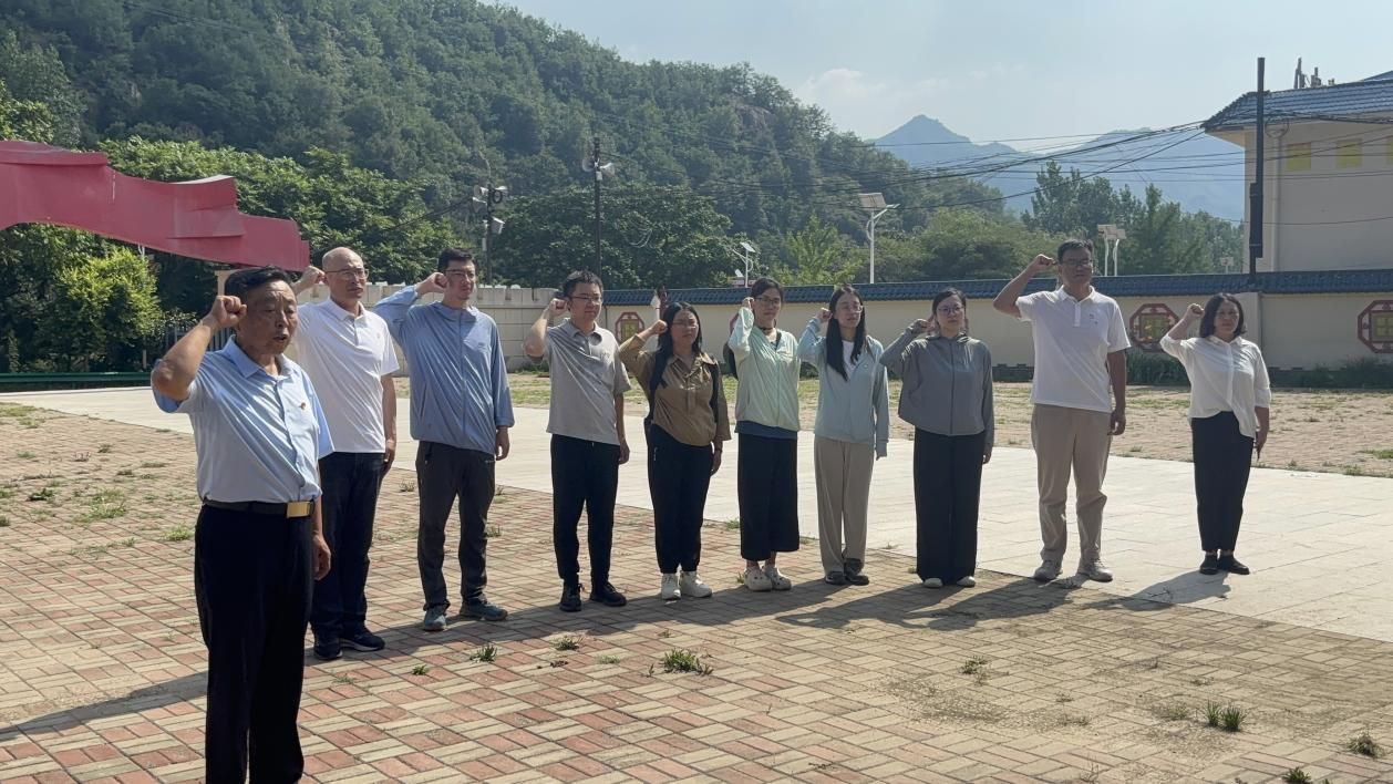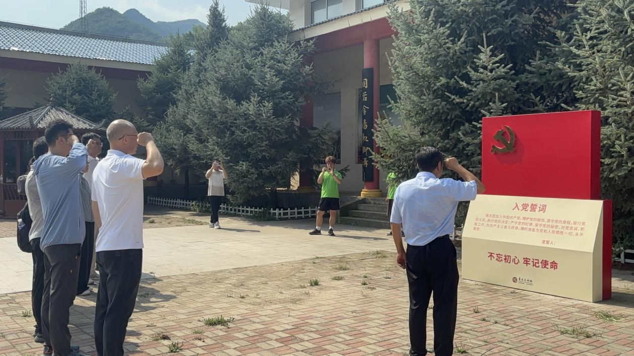 之后,由王对兴、李家庚带领实习队临时党支部成员在纪念馆前重温入党誓词。铮铮誓言中,青年教师党员们再次体悟“铜墙铁壁花厂峪,固若金汤靴脚沟”的精神内核。
