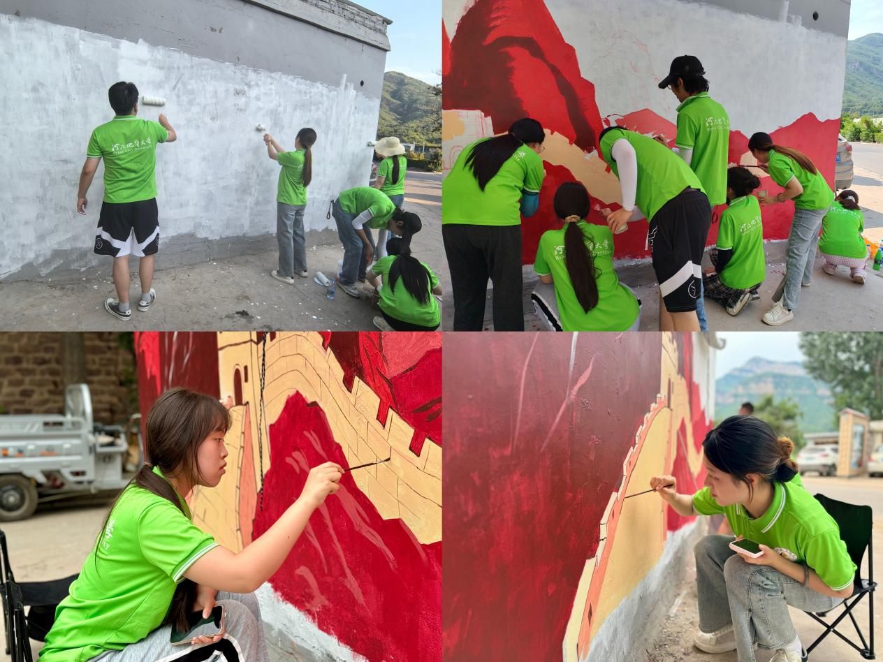 实践期间,团队成员分工协作、干劲十足。大家顶着烈日调配颜料、勾勒线条,将嶂石岩的赭红峭壁与长城的斑驳城砖巧妙融入画面,用细腻笔触捕捉自然之美与历史沧桑。每一笔勾勒都凝聚着对乡村的热爱,每一抹色彩都承载着对土地的深情。墙绘不仅美化了村落环境,更打通了艺术融入乡村生活的 “最后一公里”,让地域文化在笔墨间流转,成为有温度的乡村风景,实现了实践育人与乡村提质的双向赋能。