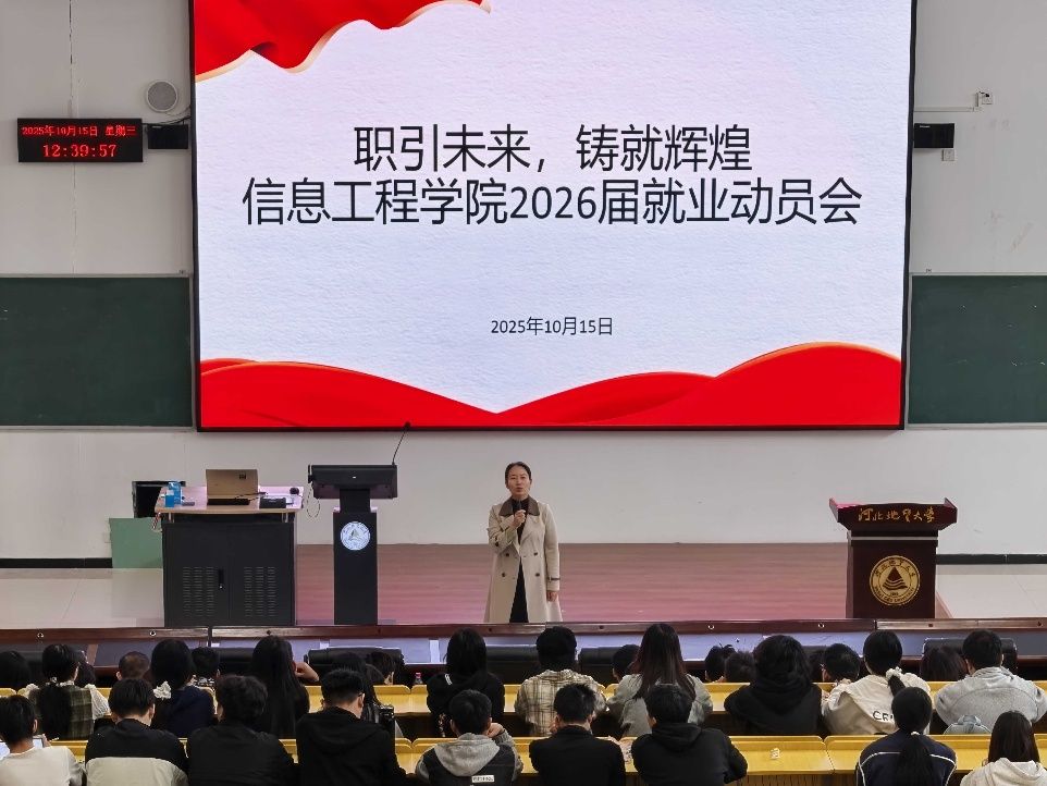 为切实做好2026届毕业生就业工作,帮助同学们认清当前就业形势,把握求职机遇,10月15日,英国beat365官方网站信息工程学院隆重召开“职引未来 铸就辉煌”毕业生就业动员大会。学院党委书记郭宏、副书记贾佳、副院长赵占芳、26届辅导员陈皓天、张琦出席会议,2022级全体毕业生参加。