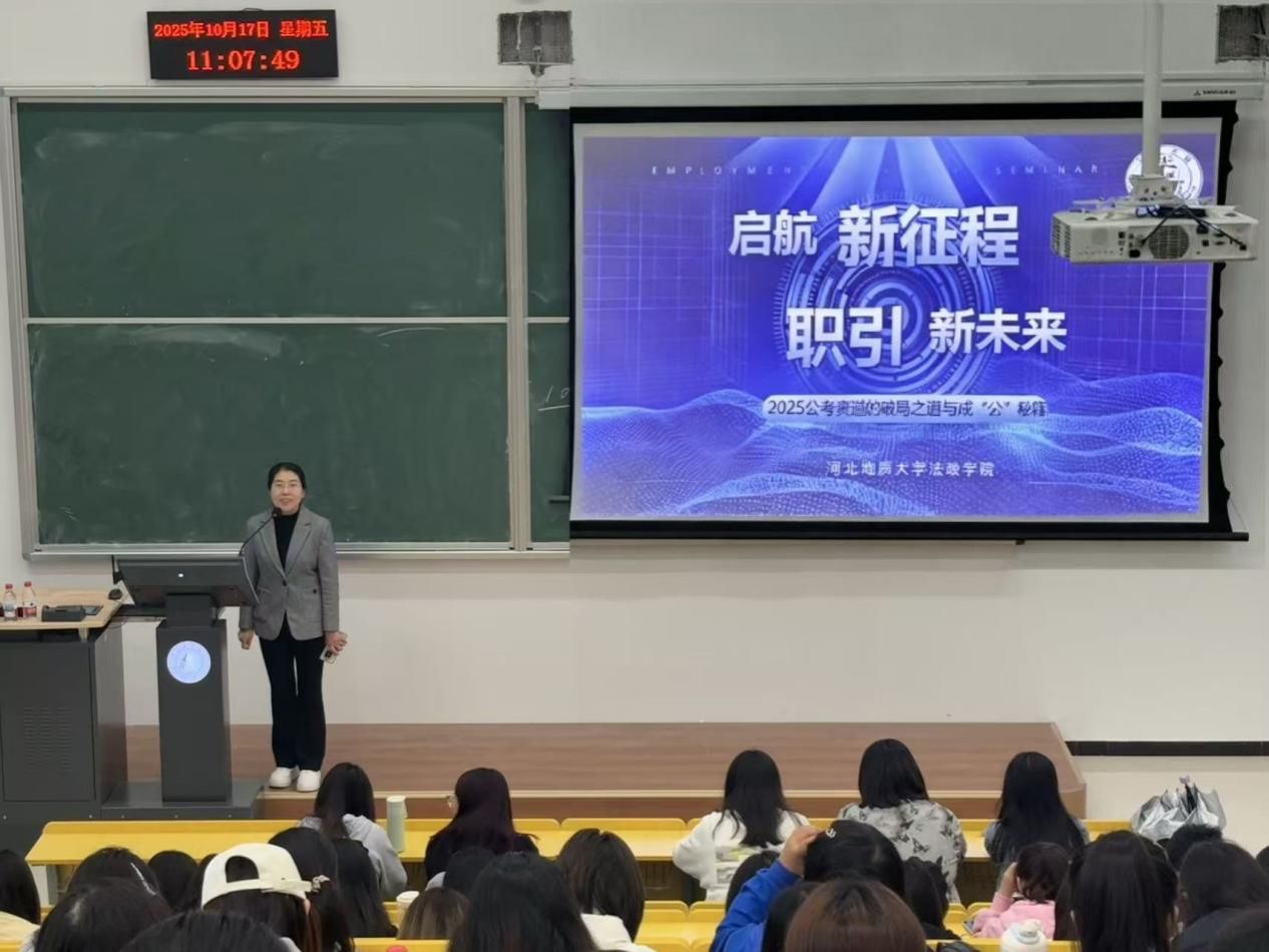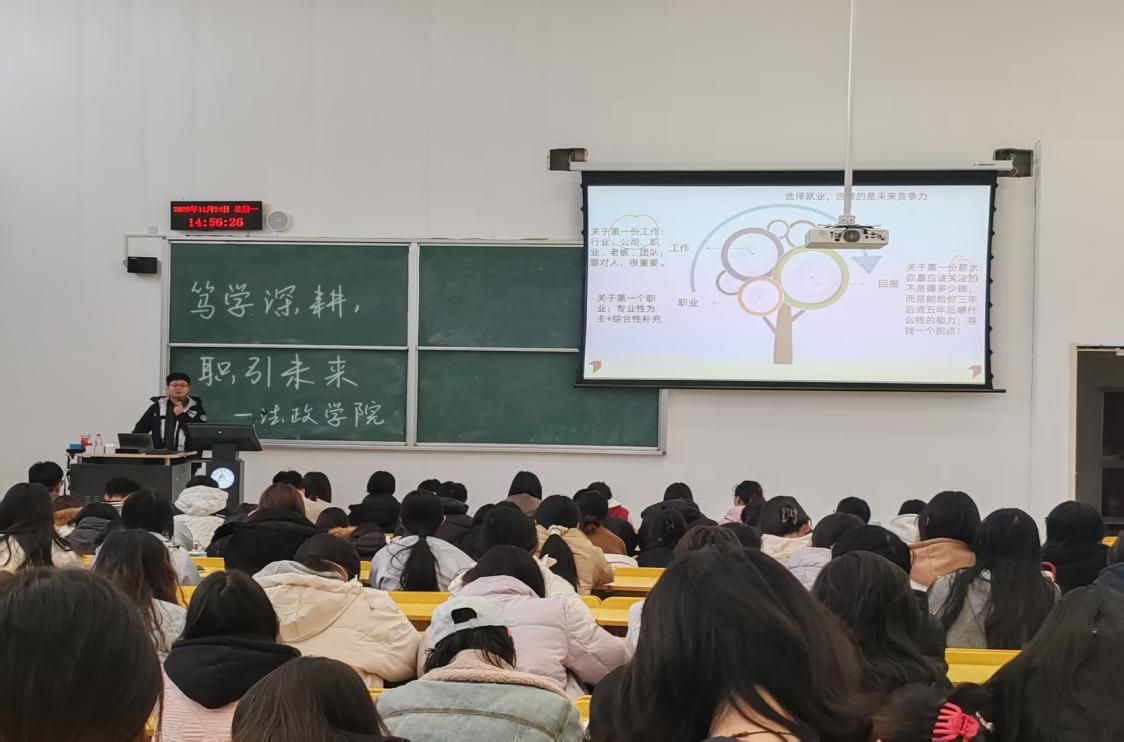 十一月份,法政学院举办“笃学深耕,职引未来”讲座,由学院研究生赵永乐结合自身实践经历,围绕就业、考公、考研三大核心为同学们带来了一场干货满满的分享。针对就业,他从自身经历出发,建议同学们积累实践经验,在简历中突出核心竞争力,同时注重面试中的沟通逻辑与心态调整。针对考研规划,结合考研的报考趋势,从院校选择、复习方法等方面提供了具体建议。针对考公,结合备考经历,详细拆解了考公流程、岗位选择、备考计划等关键内容,考公需兼顾“政策解读”与“能力提升”,建议同学们密切关注招考公告,根据自身条件筛选岗位,同时制定科学的备考计划,分阶段攻克行测、申论重点难点。