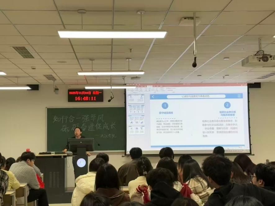 樊一璠从“高效学习方法”切入,结合学科特点,强调“靶向发力、循序渐进”的学习逻辑,为同学们分享了有关课堂学习、课后复盘、考前冲刺的学习技巧;宋家琛则聚焦科研与社会实践的协同发展,分享了他参与科研项目、投身社会调研的成长路径,结合自身参与的实践项目,讲解了如何将专业知识与社会需求结合,在实践中深化学习成效。王晗分享了自己的学业轨迹与成长感悟,结合军旅生涯锤炼的坚毅品格,从职业方向定位、求职能力提升、职场心态塑造三个维度,为新生们解读了就业积累期的核心要点,鼓励大家提前规划职业路径,在学习中积累技能,在实践中打磨心态,以扎实的素养应对未来挑战。最后,辅导员张丽霞老师进行总结讲话,希望同学们以优秀榜样为标杆,树立明确的学习目标,培养良好的学习习惯,主动参加科研与社会实践,在学风建设中主动作为、奋勇争先,明确成长方向,不负韶华时光。