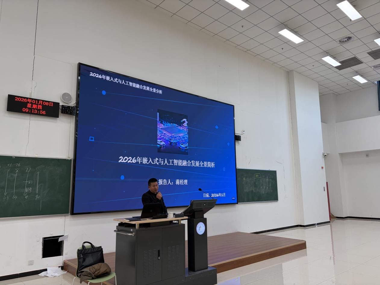 报告伊始,蒋大伟经理便点明嵌入式与人工智能融合是当下极具潜力的技术赛道,围绕该领域的行业发展前景展开深入剖析。他结合行业动态与技术演进规律,为同学们描绘了该领域的广阔发展空间,让大家对前沿技术的应用场景和未来走向有了更清晰的认知。