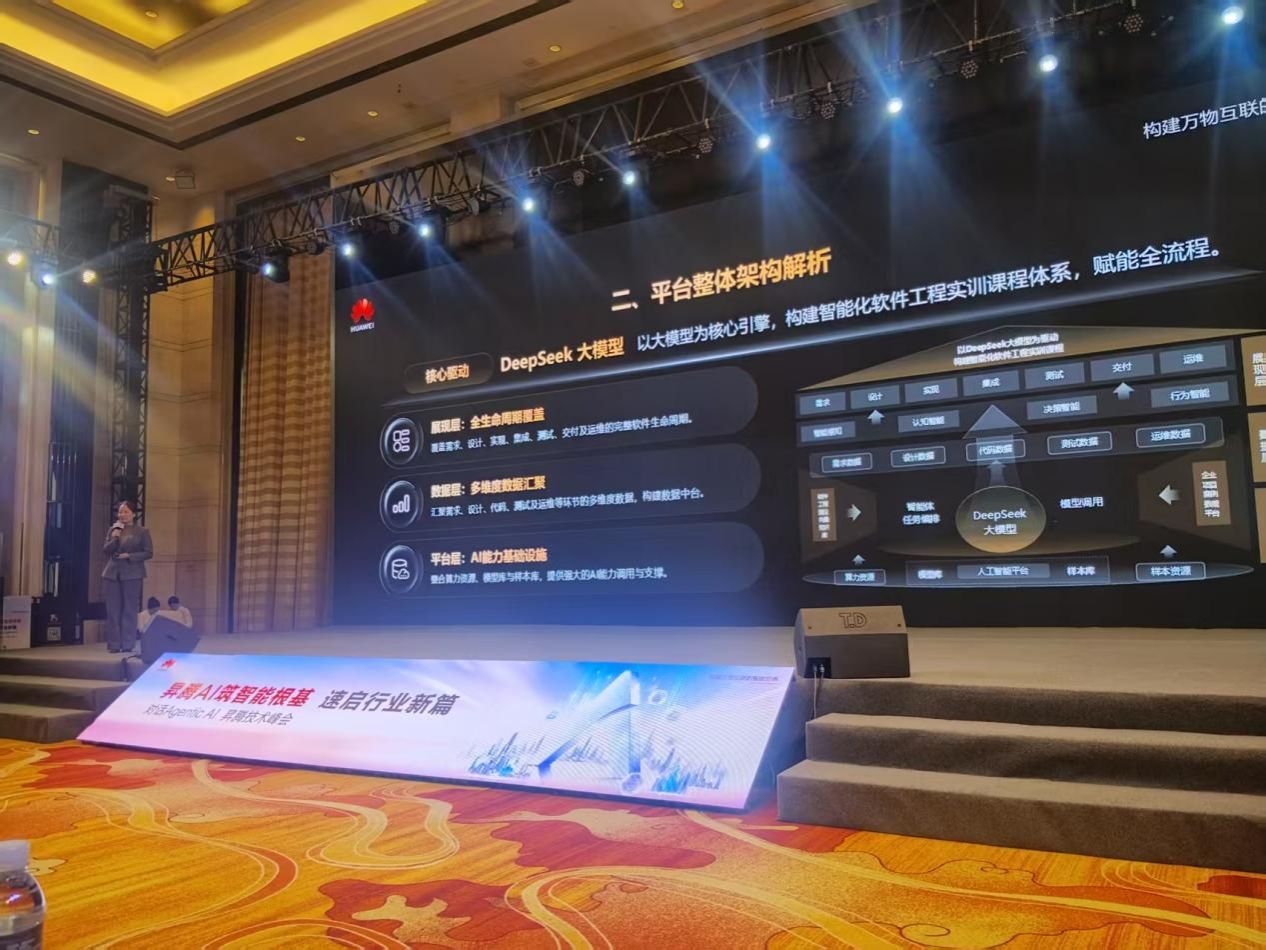 在本次AI技术峰会上,赵占芳教授所分享的产品,是信息工程学院深化校企合作、推动成果转化的典型代表——基于DeepSeek大模型的软件工程实习实训平台。该平台紧扣软件工程实习实训过程中长期存在的“教”与“学”痛点,依托DeepSeek大模型的强大能力,对软件开发全生命周期进行智能化赋能,实现了从需求分析、项目设计、代码编写、测试部署的全过程监控到成果评价的全流程智慧化管理。