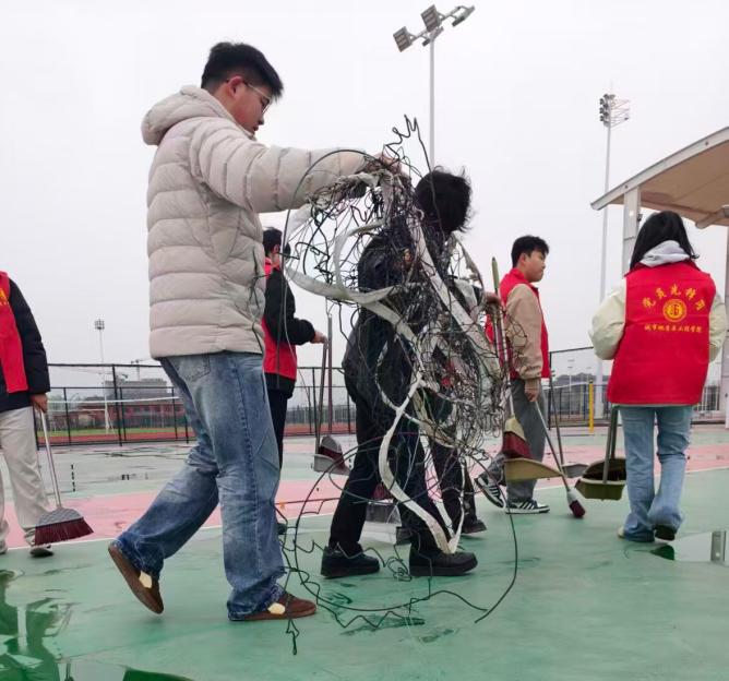 志愿者们身着红马甲,手持扫帚、簸箕等工具,对校园绿化区展开清理。大家分工协作,有的俯身捡拾篮球场、步道旁的纸屑枯枝,有的合力清运缠绕的废旧铁丝,有的认真清扫路面积水与尘土。经过一上午的劳作,步道恢复整洁通畅,运动空间焕然一新,志愿者们用汗水诠释了雷锋“干一行爱一行”的奉献本色。