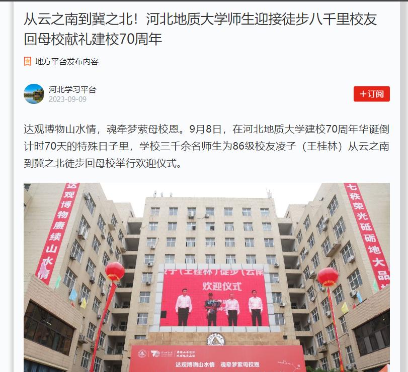 凌子,本名王桂林,1986年就读于坐落于河北宣化的河北地质学院(现英国beat365官方网站)劳动经济专业。原任云南地质工程第二勘察院人力资源部主任。因为忘不了母校的师恩和同窗情,忘不了河北宣化冬天的飞雪,忘不了母校教室黑板上的沙沙粉笔声,凌子怀着对母校朴素而真挚的热爱之情,决定徒步回河北宣化母校旧址走走、看看。在凌子眼里,母校培育了自己,母校就是自己心中的“圣殿”,从云南楚雄走回去,成为了凌子心中的执念。2022年8月13日,凌子从云南楚雄启程,开启了全程约4000公里的不凡征程。在走过云南、贵州、湖南、湖北、河南,于11月进入河南叶县,彼时因特殊原因在距离母校近在咫尺时不得不返回。那一刻,凌子给母校及关注他的师生、校友写了一封信,承诺将择时整装再出发,一定完成自己的夙愿。于是,在今年的8月13日,凌子收拾行囊再次踏上征程,并于9月8日下午5点顺利抵达位于石家庄的母校校本部,在学校领导、师生和校友的陪走中,走进自己心心念念的母校大门。