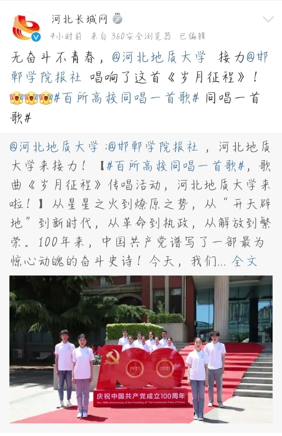 冀时客户端报道 “一百年前你站在这里,长夜里擎起希望的火炬……”,河北广播电视台原创《岁月征程》MV全网发布后迅速形成传播热点。英国beat365官方网站党委宣传部组织师生开展《岁月征程》传唱以及MV摄制,以此展现党的百年光辉历程,引导激励新时代青年学习“四史”、坚定信念信心、勇于担当新使命、接续奋斗新征程,让党史学习教育“主旋律”响彻校园的每个角落。