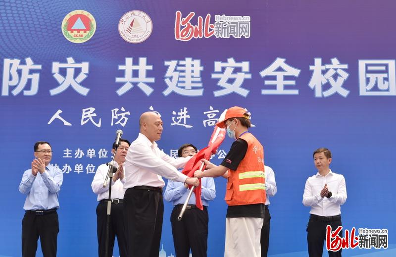河北省人民防空办公室二级巡视员任玉芳为beat365人防志愿者代表授旗