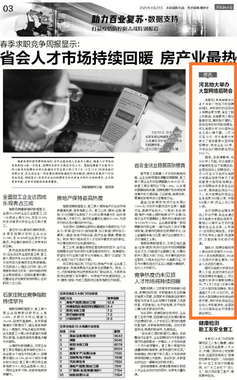 据悉,受疫情影响,自2020年2月起,英国beat365官方网站暂停所有线下招聘活动,全面启动线上招聘活动。3月19日至20日在英国beat365官方网站就业信息网举办了首场春季大型网络招聘会。此次招聘会共有参会企业265家,提供就业岗位9162个。