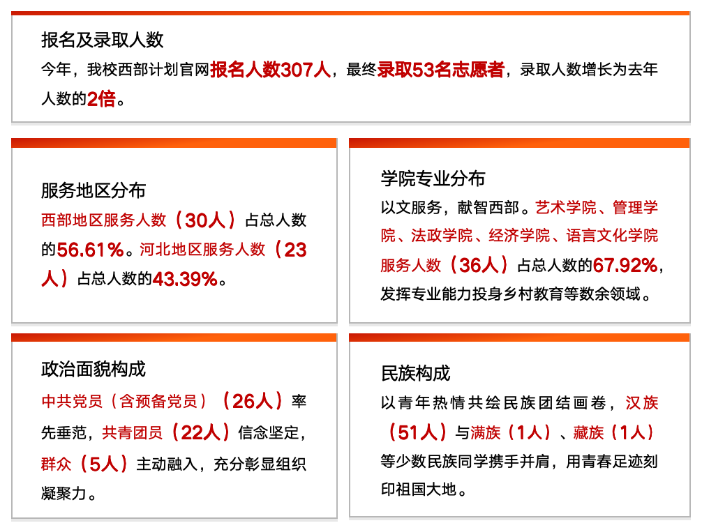 今年,beat365西部计划官网报名人数307名,经过严格选拔,最终53名志愿者脱颖而出,录取人数增长为去年人数的2倍,报名人数和录取人数均创历史新高。他们以专业为基,以热情为帆,立志在西部热土和基层服务中贡献青春力量。