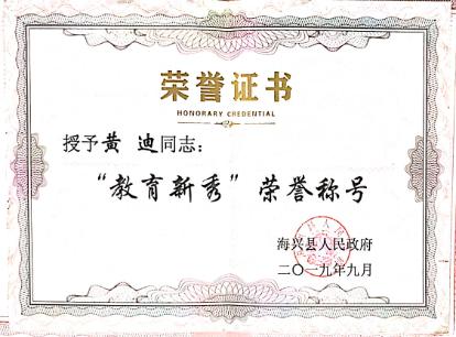 有人说,爱自己的孩子是人,爱别人的孩子是神。黄迪虽然不是神,但她无私地把自己所有的时间都留给了学生和家长们。课上,她擅于创新教学方式、寓教于乐,通过一个个精心设计的课堂小活动带领孩子们畅游知识海洋;课间,哪个孩子没洗脸,哪个孩子系错扣子,都没能逃得过她的“法眼”;课下,她又化身家庭教育导师,不厌其烦地与家长在微信上沟通交流、答疑解问。据不完全统计,她的日回复家长消息数远超50条,她把所有的爱都给了这48个孩子也成了他们口中亲切的“黄妈妈”,在2019年荣获海兴县政府颁发的“教育新秀”荣誉称号。
