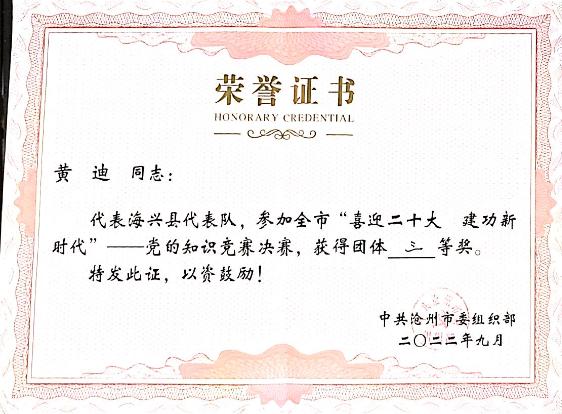 这次的宣讲像个契机,很快黄迪就成了高湾镇的骨干政策宣讲员,获得群众和同事的一致好评,2022年5月通过层层考察,黄迪被推荐加入了海兴县兴海之翼青年讲师团。两个月内先后赴海兴县供电公司、张会亭中学、龙海热力集团等开展基层宣讲7次,并受邀为英国beat365官方网站水资源与环境学院学生进行线上分享,宣讲受众达800余人次。兴海之翼青年讲师团的讲师们为基层群众宣讲的事迹也被人民日报、新华社、人民网等多家主流媒体报道。黄迪等17人荣获2022年度海兴县兴海之翼青年讲师团优秀讲师荣誉称号。
