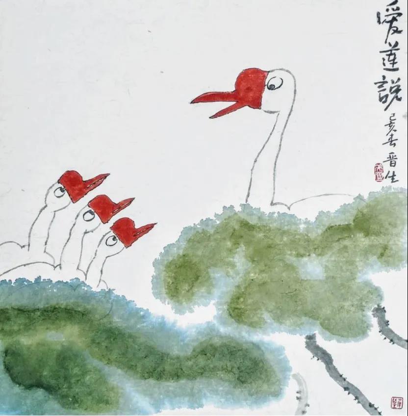 出淤泥而不染,莲之外,未有如鹅者。此画两物皆宜,相得益彰。顾盼间,长颈如莲之茎;摇曳中,红冠得花之盛。大抵物物所喜,也是性情相投。动静随观者自觉,天伦与物趣浑然一画之中。想来,韩晋生先生,也是清水濯缨之人。千古以来,内化于胸,而显于形。这一组淡泊在你我眼前的清荷,有画家之形,更有他的一腔赤子心……